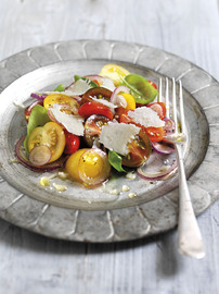 - Arrange tomatoes, onion and salad leaves on serving plates and drizzle over plenty of dressing.