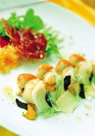 Sauté the finely sliced onion in olive oil. Add the scallops and let them brown. Place the prosciutto slices on the oven pan already greased with oil and cook until they are nice and crispy. Arrange a row of scallops on a dish, cover them with the Bertozzi Parma Flakes and the sliced truffle. Dress with a drizzle of olive oil from the pan. Accompany with a salad of crispy prosciutto slices, fried onion, string beans and parsley dressed with vinaigrette made from olive oil, lemon juice, salt and pepper.
